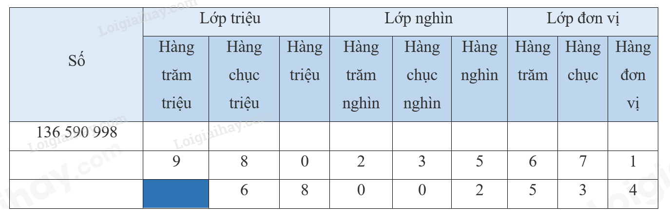 Viết số lần lượt từ hàng trăm triệu, hàng chục triệu, hàng triệu,hàng trăm nghìn, hàng chục nghìn, hàng nghìn, hàng trăm, hàng chục, hàng đơn vị