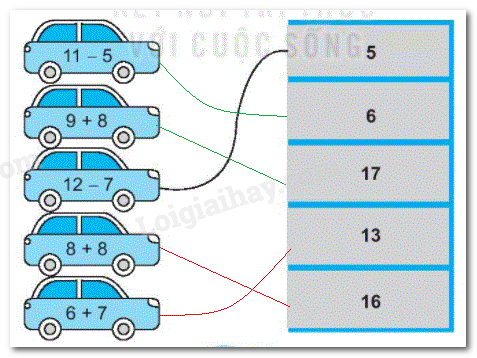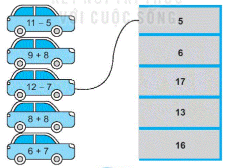 Tính nhẩm kết quả phép tính ghi trên mỗi ô tô rồi nối với số tương ứng ở cột bên phải.