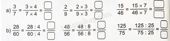 Cùng giảm 5 lần tử số và mẫu số của phân số trong tấm thẻ bên … Khoanh vào các phân số bằng nhau trong các phân số sau 4/6