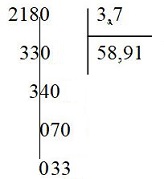 Thực hiện phép tính chia \(218 : 3,7\) (lấy đến hai chữ số ở phần thập phân của thương) sau đó bằng cách dóng một đường thẳng từ dấu phẩy của số bị chia ban đầu, coi \(218 = 218,0\), ta tìm được số dư của phép chia đó.