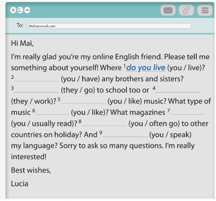 1. Write the questions. 2. Make the questions from the prompts. 3. Complete the dialogue with the correct words. 4. Complete the email with the correct form of the verbs in brackets.