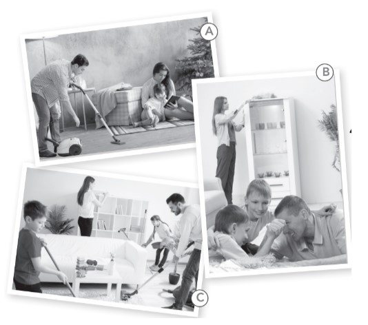 (Tranh C: Gia đình bốn người, bố mẹ và con cái chia sẻ việc nhà.)
