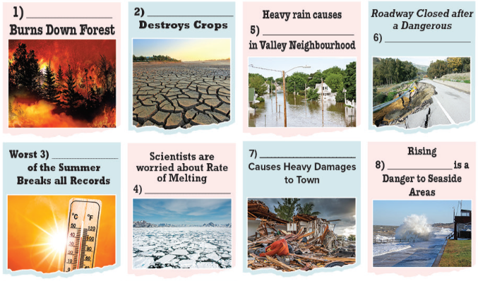 4. Complete the newspaper headlines (1-8) with Hurricane, Ice Caps, Floods, Heatwave, Wildfire, Sea Levels, Drought and Landslide. Then listen and check.