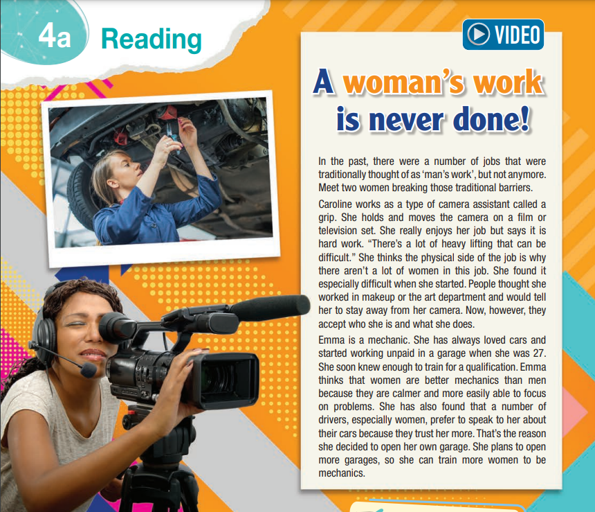 1. Read the title and look at the pictures. What do you think the text is about? Listen and read to find out. 2. Read the text. Write C for Caroline or E for Emma. Who … 3. Read the text again and answer the questions. 4. Listen and repeat. Match the jobs (1–8) to the job descriptions (a–h) and make sentences as in the example. 5. Are there jobs mainly for men or women? What are the difficulties for women who do “men’s jobs”? 6. Write a short paragraph (about 120 words) describing your dream j