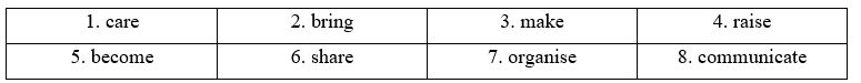 (Điền vào mỗi chỗ trống với bring, care, organise, communication, become, share, make hoặc raise.)