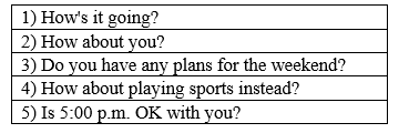Tom: 3) Do you have any plans for the weekend?