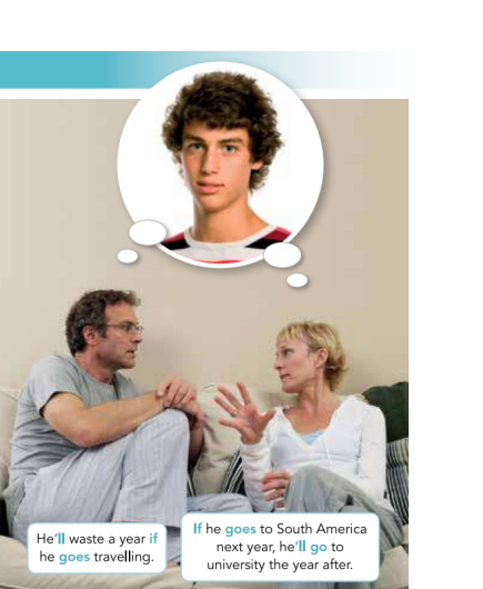 1. Read UK TODAY. What is a gap year? Discuss whether you think it's a good thing to do. Give reasons for your answers. 2. Look at the photo of Ricky's parents and read the sentences. Who do you think is in favour of Ricky doing a gap year and who is against? 3. Read the GRAMMAR FOCUS. Complete the examples. Use the First Conditional form in Exercise 2. 4. Match the halves of the sentences from the conversation. Then listen and check. 5. Complete the sentences with the correct form of the verbs