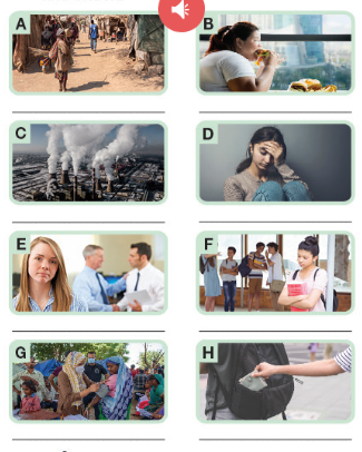 (Điền vào mỗi khoảng trống với các từ depression, obesity, bullying, poverty, crime, healthcare, pollution or gender inequality. Sau đó nghe và kiểm tra.)