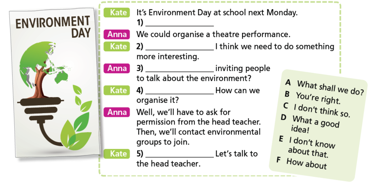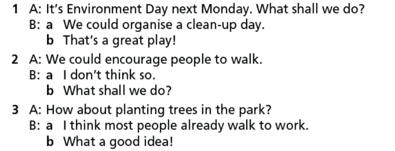 1. A: Ngày môi trường vào thứ hai tới. Chúng ta nên làm gì đây?