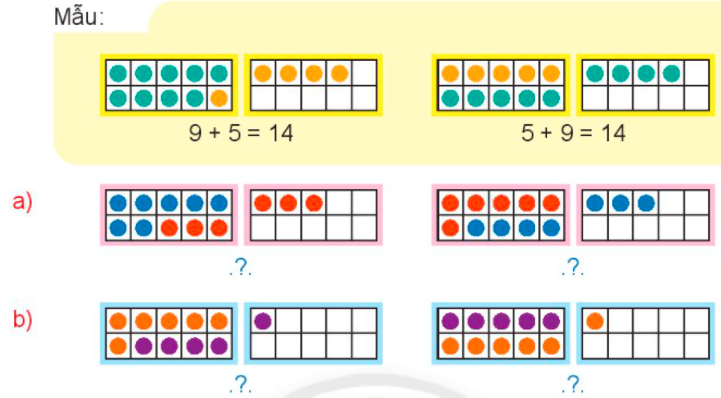 – Viết phép tính để tìm tổng số chấm tròn màu xanh và màu đỏ.