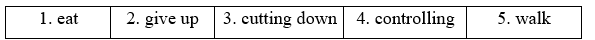 It wasn’t as bad as I’d expected. I had to 1) ________ much less sugar, of course, and 2) ________ bad habits like late night pizza altogether, but that was OK. The hardest part for me was 3) ________ on salt! The key to success for me is 4) ________ size of food portions, but never missing a meal. I also 5) ________ for half an hour every day up in the forest, and that’s really helped my fitness.