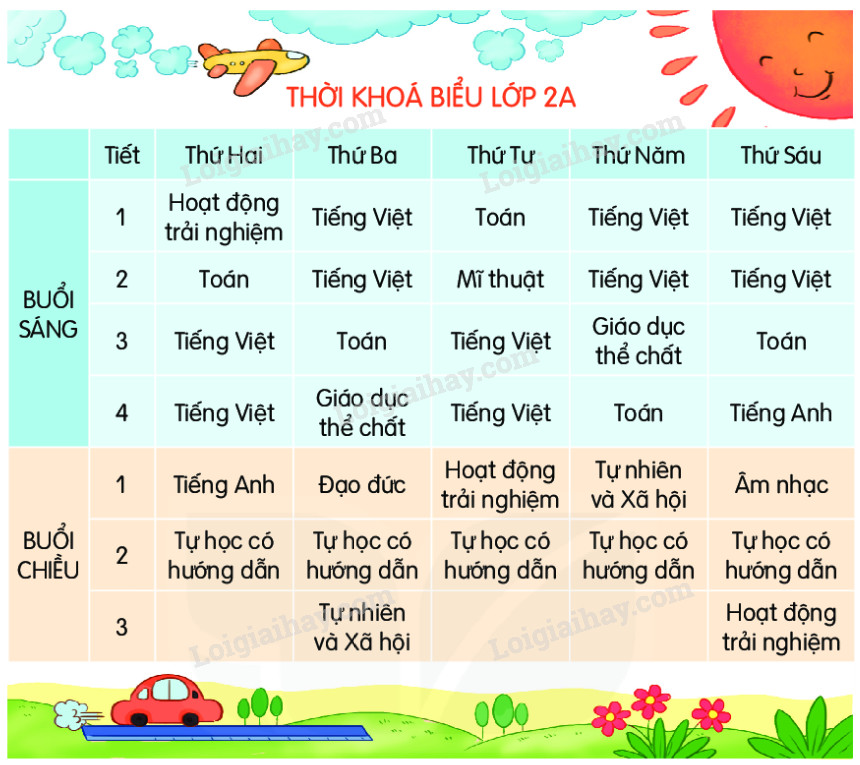 – Buổi sáng: Hoạt động trải nghiệm, Toán, Tiếng Việt, Tiếng Việt.