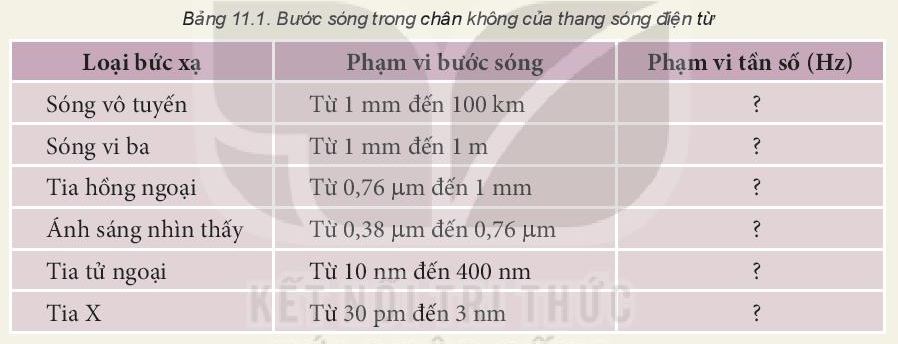 Bảng 11.1 cho biết phạm vi của bước sóng trong chân không của các dải chính tạo nên thang sóng điện tử.