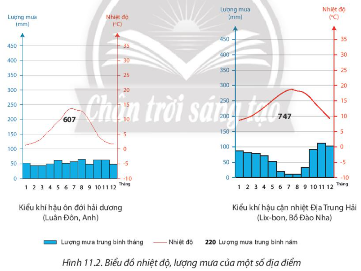 Quan sát hình 11.1, 11.2 (chú ý nhiệt độ và lượng mưa được thể hiện trên biểu đồ để phân tích).