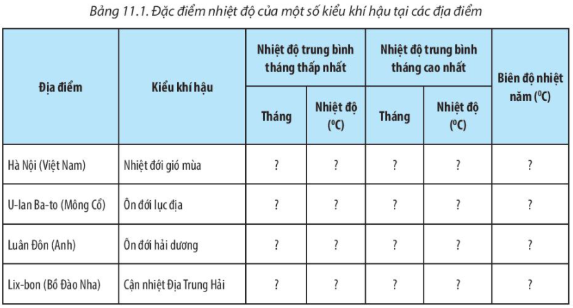 1. Có bao nhiêu đới khí hậu trên Trái Đất và phạm vi của các đới khí hậu này. Trong các đới khí hậu có những kiểu khí hậu nào? Việt Nam nằm trong đới khí hậu nào? Thuộc kiểu khí hậu nào? 2. Xác định các địa điểm trên thuộc đới khí hậu nào trên bản đồ. Điền các thông tin phân tích nhiệt độ và lượng mưa theo các bảng. 3. Thu thập thông tin về một số hiện tượng thời tiết trong thực tế như: sương, mưa đá,… Viết 1 báo cáo ngắn giải thích nguyên nhân gây ra các hiện thược trên.