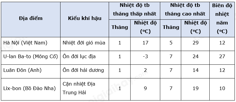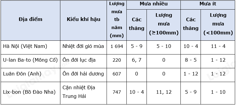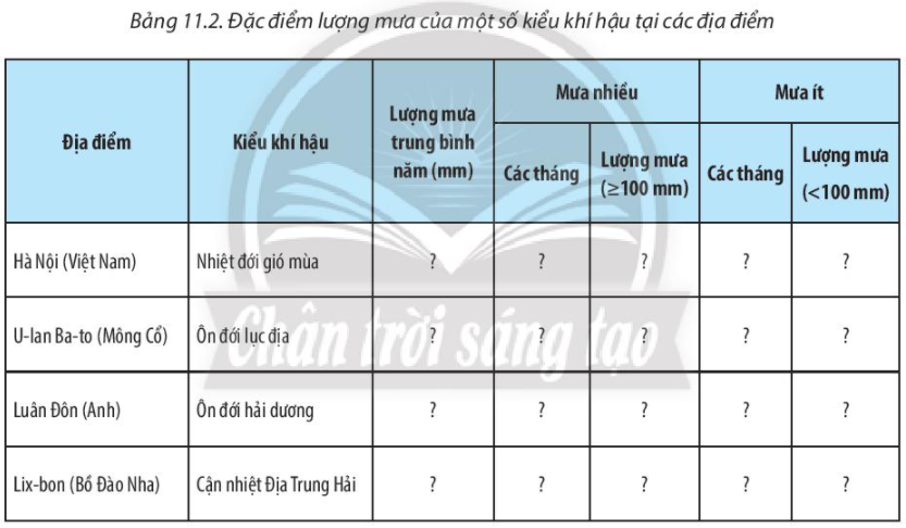 – Điền các thông tin phân tích nhiệt độ và lượng mưa theo các bảng sau: