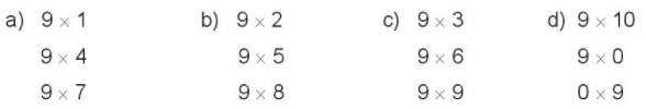 c) 9 x 3 = 27                          d) 9 x 10 = 90