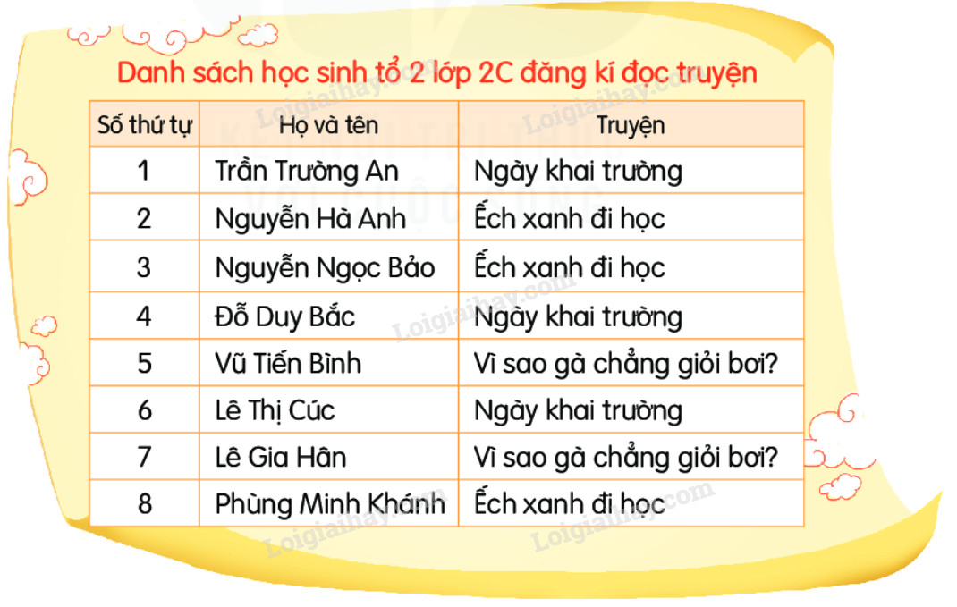 Hôm nay, chúng tôi được đọc truyện tại lớp. Cô giáo cho chúng tôi đăng kí đọc truyện theo sở thích. Dưới đây là danh sách đăng kí của tổ tôi.