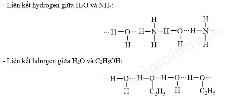 – Liên kết hydrogen giữa H2O và một phân tử NH3 hình thành khi: H của H2O liên kết được với nguyên tử khác (có độ âm điện lớn) còn cặp electron riêng.