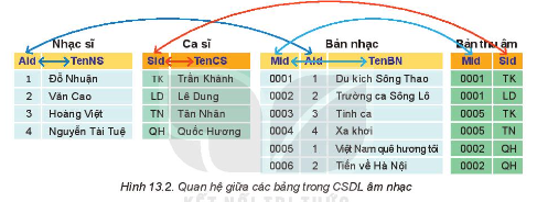 Một CSDL các bản nhạc, trên một trang website âm nhạc, được tổ chức như mô tả trong Hình 13.1, gồm có danh sách các tên nhạc sĩ với mã (định danh) là Aid (Hình 13.1a), danh sách các tên ca sĩ với mã (định danh) là Sid (Hình 13.1b), danh sách các bản nhạc với tên bản nhạc, mã nhạc sĩ (tác giả bản nhạc ) và mã Mid-định danh bản nhạc (Hình 13.1c), danh sách các bản thu âm gồm có mã bản nhạc và mã ca sĩ (Hình 13.1d). Hãy quan sát và trả lời các câu hỏi sau: