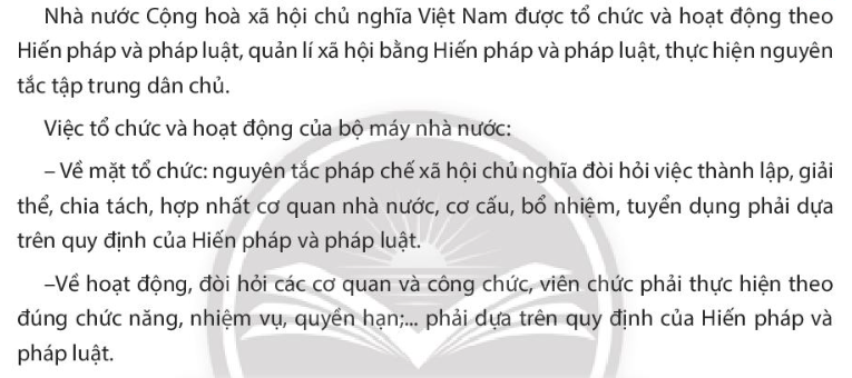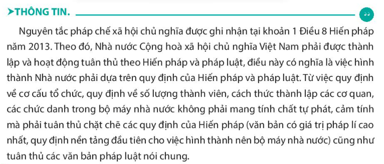 Đọc thông tin kết hợp với thông tin đã tìm hiểu, nêu biểu hiện của nguyên tắc tắc pháp chế xã hội chủ nghĩa trong tổ chức và hoạt động của bộ máy Nhà nước Cộng hòa xã hội chủ nghĩa Việt Nam.