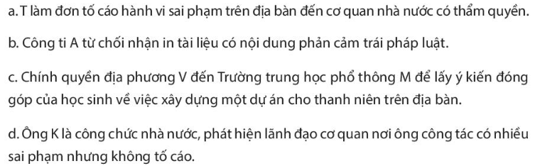 a – Hành vi của T rất đúng vì T đã thực hiện quyền của mình trong việc tố cáo các hành vi sai phạm đến cơ quan nhà nước có thẩm quyền.