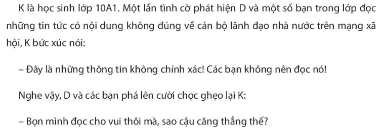 – Em đồng tình với ý kiến của K vì K đã có trách nhiệm trong việc bảo vệ bộ máy nhà nước khi đã xác thực và ngăn cản các hành vi bêu xấu về cán bộ lãnh đạo nhà nước trên mạng xã hội.