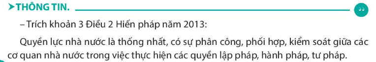 – Đọc thông tin 1 kết hợp với hiểu biết đã có, nêu cách hiểu của em về nguyên tắc quyền lực nhà nước là thống nhất nhưng có sự phân công, phối hợp, kiểm soát.