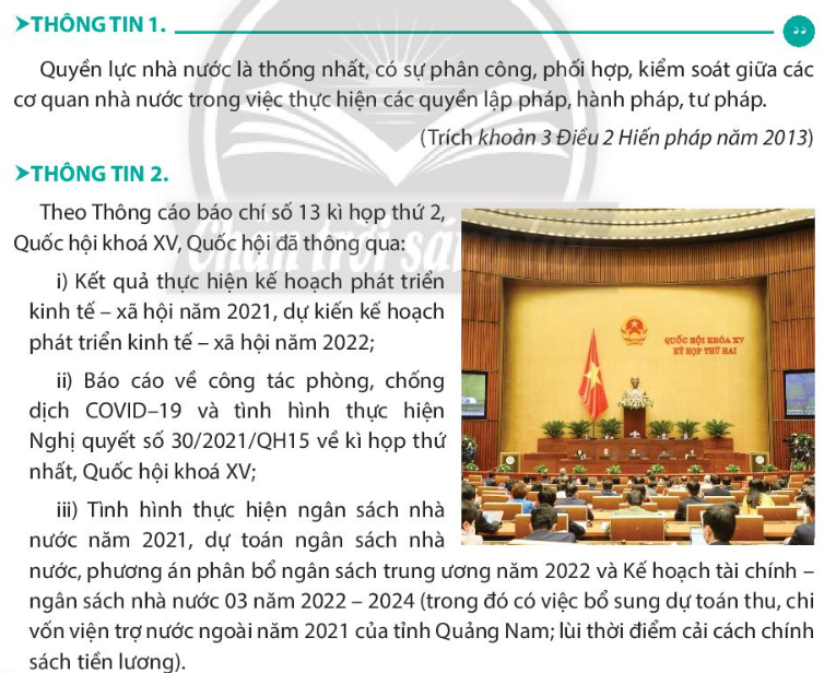– Đọc thông tin 2 kết hợp với thông tin đã tìm được, nêu biểu hiện của nguyên tắc tập trung dân chủ trong tổ chức và hoạt động của bộ máy Nhà nước Cộng hòa xã hội chủ nghĩa Việt Nam