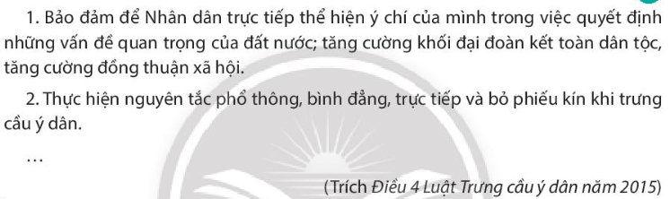 Đọc thông tin và nêu nguyên tắc quyền lực nhà nước thuộc về nhân dân được thể hiện trong khoản 1 và 2 Điều 4 Luật Trưng cầu ý dân năm 2015.