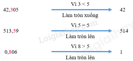 Khi làm tròn số thập phân đến số tự nhiên gần nhất, ta so sánh chữ số ở hàng phần mười với 5. Nếu chữ số hàng phần mười bé hơn 5 thì làm tròn xuống, còn lại thì làm tròn lên.