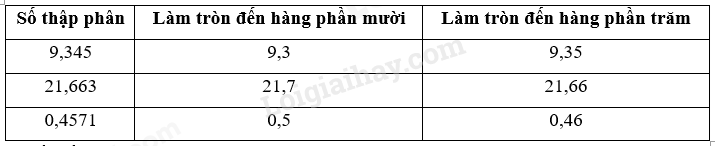 Làm tròn các số thập phân: 9,345; 21,663; 0,4571: