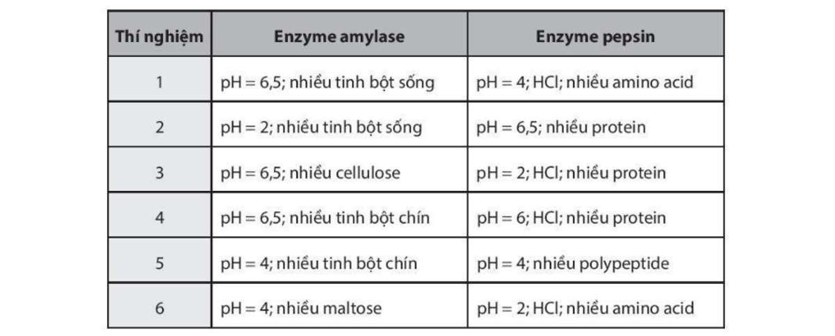 Enzyme amylase hoạt động thủy phân tinh bột chín trong môi trường pH = 6,5; còn enzyme pepsin thủy phân protein ở môi trường pH = 2. Do đó: