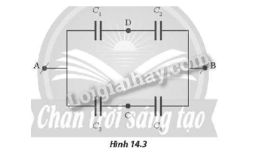 Cho các tụ điện với điện dung C1=C4=3μF,C2=C3=6μF, ban đầu không tích điện được nối với nhau theo sơ đồ như Hình 14.3. Sau đó mắc hai điểm A, B của mạch điện trên vào nguồn điện không đổi có hiệu điện thế UAB=180 V. Tính hiệu điện thế UCD.