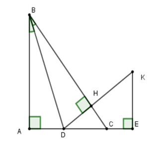 Cho tam giác \(ABC\) vuông tại \(A\) \(\left( {AB > AC} \right).\) Tia phân giác của góc \(B\) cắt \(AC\) ở \(D.\) Kẻ \(DH\) vuông góc với \(BC.\) Trên tia \(AC\) lấy \(E\) sao cho \(AE = AB.\) Đường thẳng vuông góc với \(AE\) tại \(E\) cắt tia \(DH\) tại \(K.\) Chọn câu đúng.