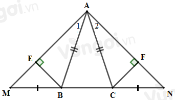 – Sử dụng kết quả câu trước \(\Delta ABE = \Delta ACF\) nên \(BE = CF\) (hai cạnh tương ứng). Từ đó chứng minh \(\Delta BME = \Delta CNF\) (cạnh huyền – cạnh góc vuông).