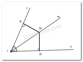 Cho góc nhọn xBy. Kẻ tia phân giác Bm của góc xBy. Trên tia Bm lấy điểm M bất kì. Kẻ MH vuông góc với Bx, MK vuông góc với By (H \( \in \) Bx, K \( \in \) By). Khẳng định sai là: