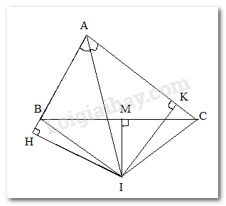 Cho tam giác ABC có AB < AC. Cho M là trung điểm của cạnh BC. Tia phân giác của góc A cắt đường thẳng qua M, vuông góc với BC tại điểm I. Qua I kẻ IH vuông góc với AB, IK vuông góc với AC ( H \( \in \) đường thẳng AB, K \( \in \) đường thẳng AC). Phát biểu nào sau đây sai: