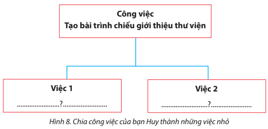 Em hãy chia nhỏ việc làm bài trình chiếu về cách sắp xếp sách trong thư viện và hoàn thiện sơ đồ ở Hình 8. Việc nào cần sử dụng máy tính để thực hiện?