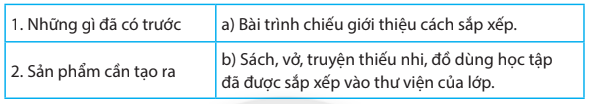 a. Các bạn trong nhóm của Huy đã sắp xếp sách, vở viết, truyện thiếu nhi, đồ dùng học tập vào thư viện của lớp. Huy được giao nhiệm vụ làm bài trình chiếu giới thiệu cách sắp xếp trong thư viện cho các bạn trong lớp.