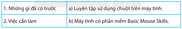 Máy tính ở nhà của Ngọc có phần mềm Basic Mouse Skill, cô giáo nhắc Ngọc cần luyện tập sử dụng chuột máy tính ở nhà. Em hãy ghép mỗi mục ở cột bên trái với mục thích hợp ở cột bên phải.