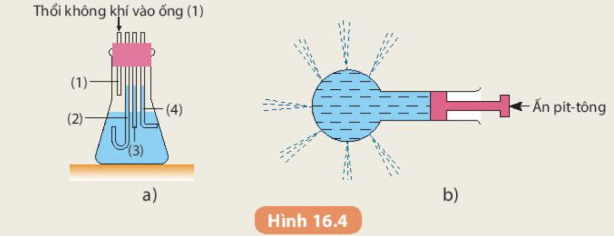 1. Hình 16.4a: khi thổi không khí vào ống (1) ở  thì thấy hiện tượng là các cột nước trong ống (2), (3) và (4) sẽ dâng lên với độ cao xấp xỉ bằng nhau.