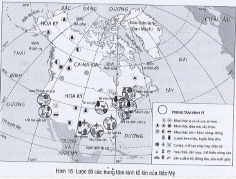 Yêu cầu b) Các trung tâm kinh tế lớn ở Bắc Mỹ tập trung ở ba khu vực chính: