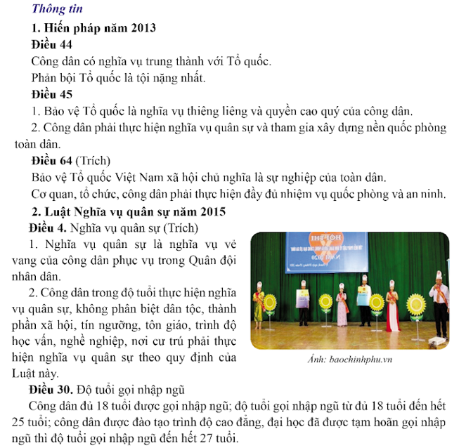 a. Đọc các thông tin và xác định các quy định của pháp luật về quyền và nghĩa vụ của công dân về bảo vệ Tổ quốc trong các thông tin đó.