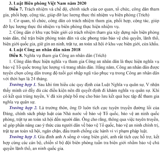 – Trường hợp 3: Gia đình anh A tham gia bảo vệ biên giới đã thực hiện đúng quy định của Luật Biên phòng Việt Nam năm 2020.