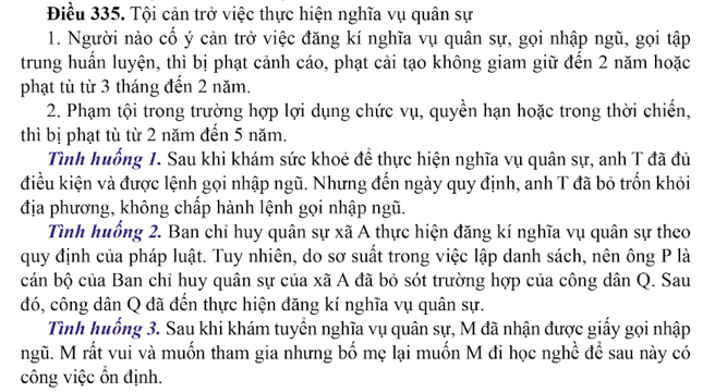 – Tình huống 3: Việc mẹ M không đồng ý việc nhập ngũ của con trai có thể dẫn đến việc cản trở, chống đối việc thực hiện nghĩa vụ quân sự.
