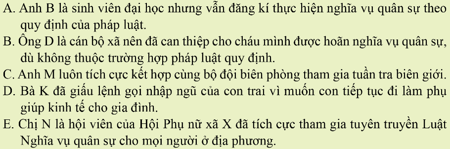 Đọc các trường hợp và chỉ ra đâu là hành vi thực hiện quy định của pháp luật về quyền và nghĩa vụ của công dân về bảo vệ Tổ quốc.