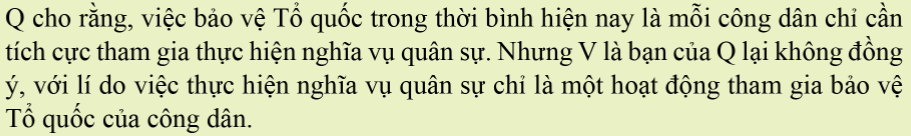 – Trường hợp 1: V đã thực hiện đúng các quy định của Hiến pháp năm 2013, Luật Nghĩa vụ quân sự năm 2015. Cụ thể, V đã tự nguyện đăng kí khám tuyển, xin tạm hoãn việc học để tham gia nghĩa vụ quân sự.