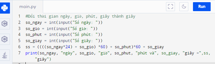 Em hãy viết chương trình đổi thời gian được tính bằng ngày, giờ, phút, giây được nhập vào từ bàn phím thành thời gian được tính bằng giây.