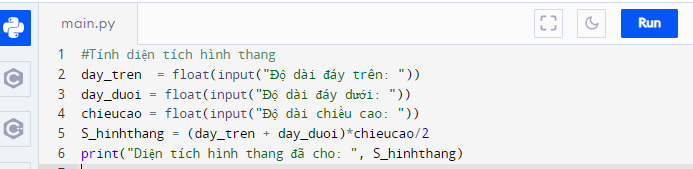 print(“Diện tích hình thang đã cho: “, S_hinhthang)